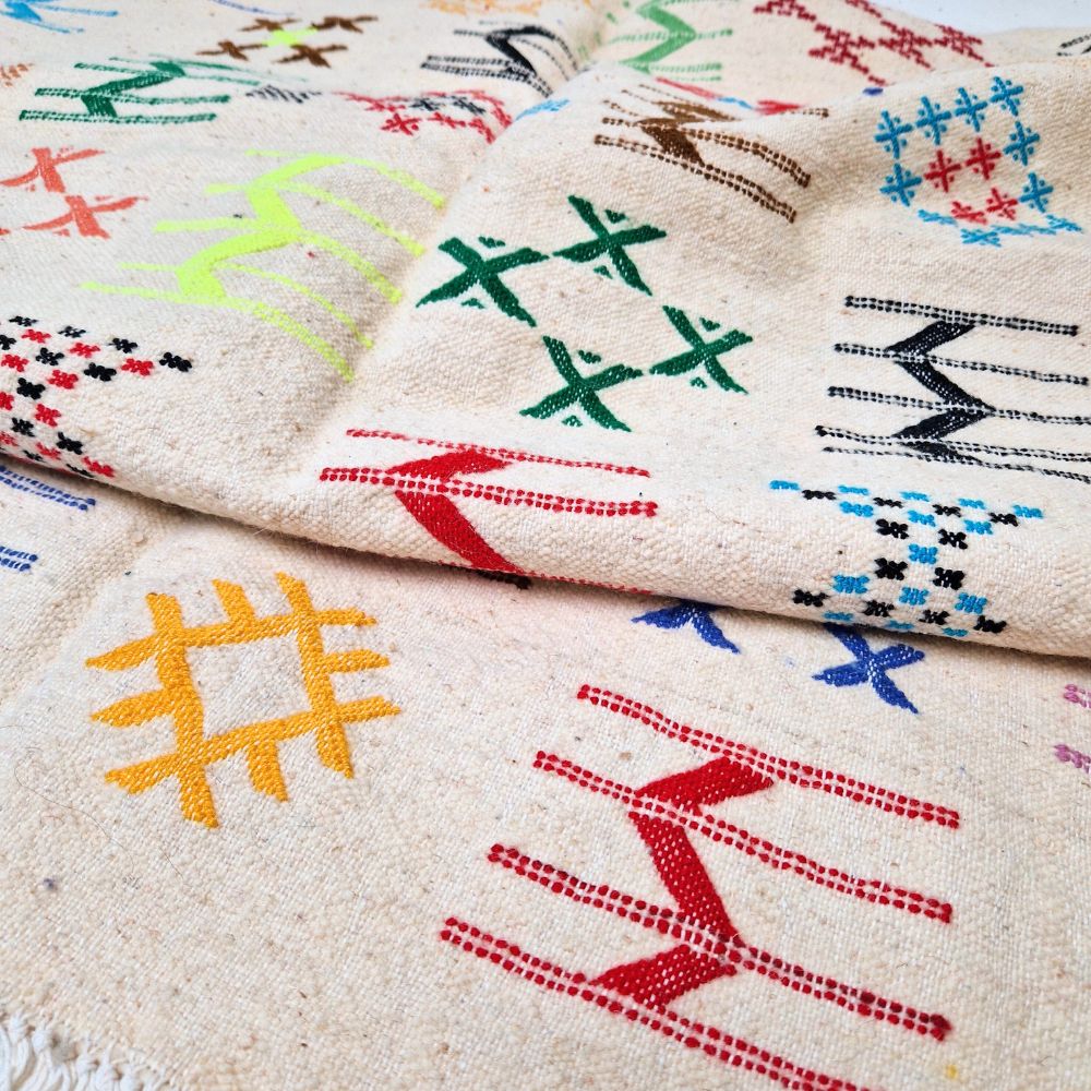 - Tissé à la main sur des métiers traditionnels par une coopérative marocaine de femmes,