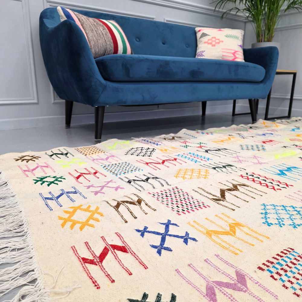 Ces tapis tissés à la main présentent des motifs distinctifs, généralement géométriques, et intègrent souvent un mélange de losanges, de triangles et d'autres formes abstraites ainsi que des symboles berbères. Les tapis Zanafi sont fabriqués à l'aide de techniques de tissage berbères traditionnelles et de matériaux naturels, tels que de la laine de haute qualité provenant de moutons locaux. En outre, ces tapis ont souvent un design minimaliste et symétrique, ce qui leur permet de s'adapter à différents styles de décoration intérieure.