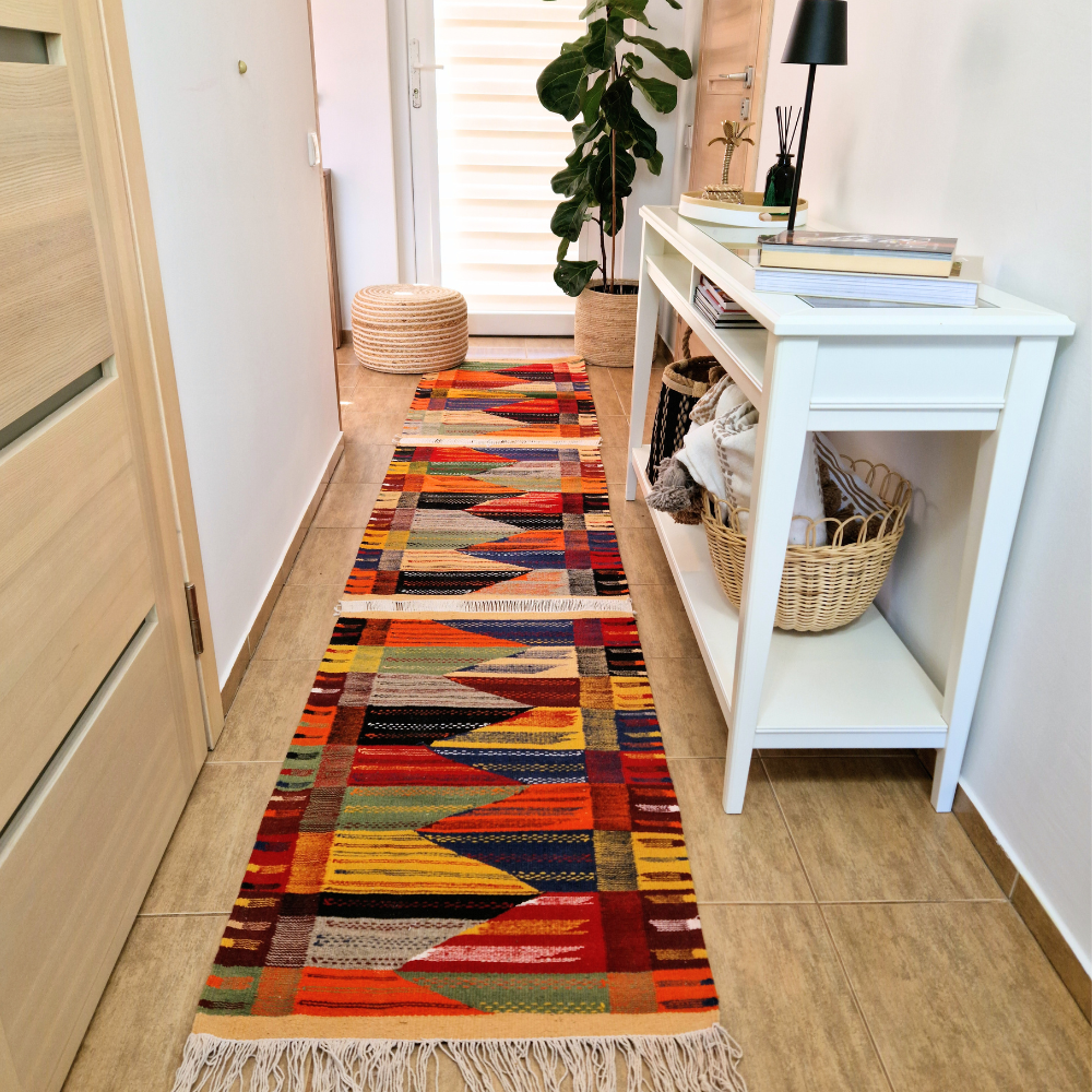 Woven from 100% premium sheep wool, this flat-woven Moroccan rug is lightweight yet durable, offering a smooth texture underfoot. Its understated design makes it ideal for modern, minimalist, bohemian, or classic interiors, whether styled as a hallway runner, bedroom rug, or elegant accent piece.